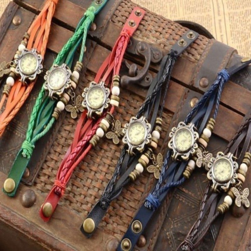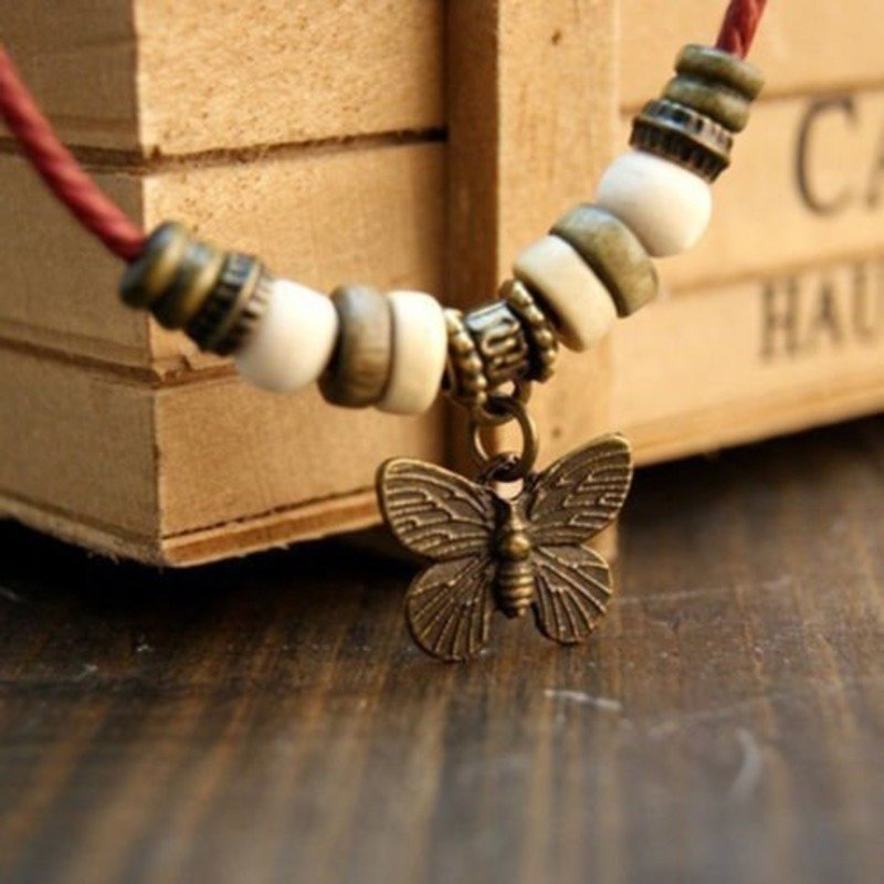 엮은 가죽 밴드와 나비 모양의 펜던트로 장식된 것이 특징입니다.